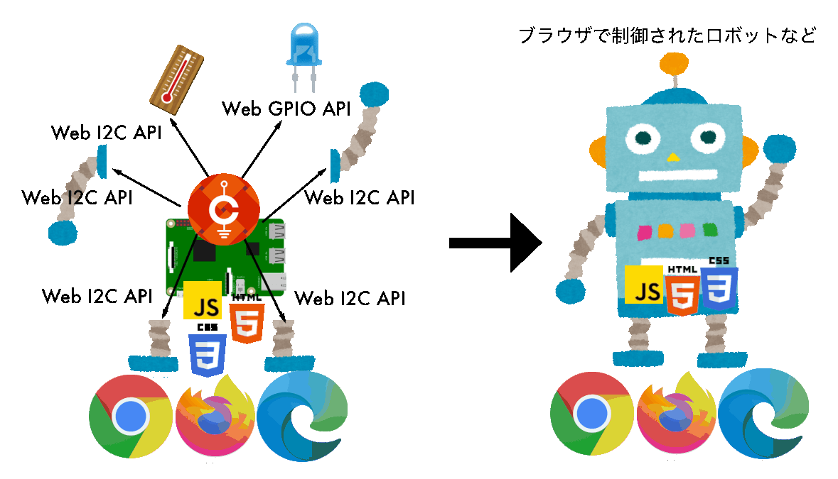 デジタルのソフトとフィジカルなハードをWWW上で連携するデバイスを Web標準技術、JavaScript だけで容易に実現できます。