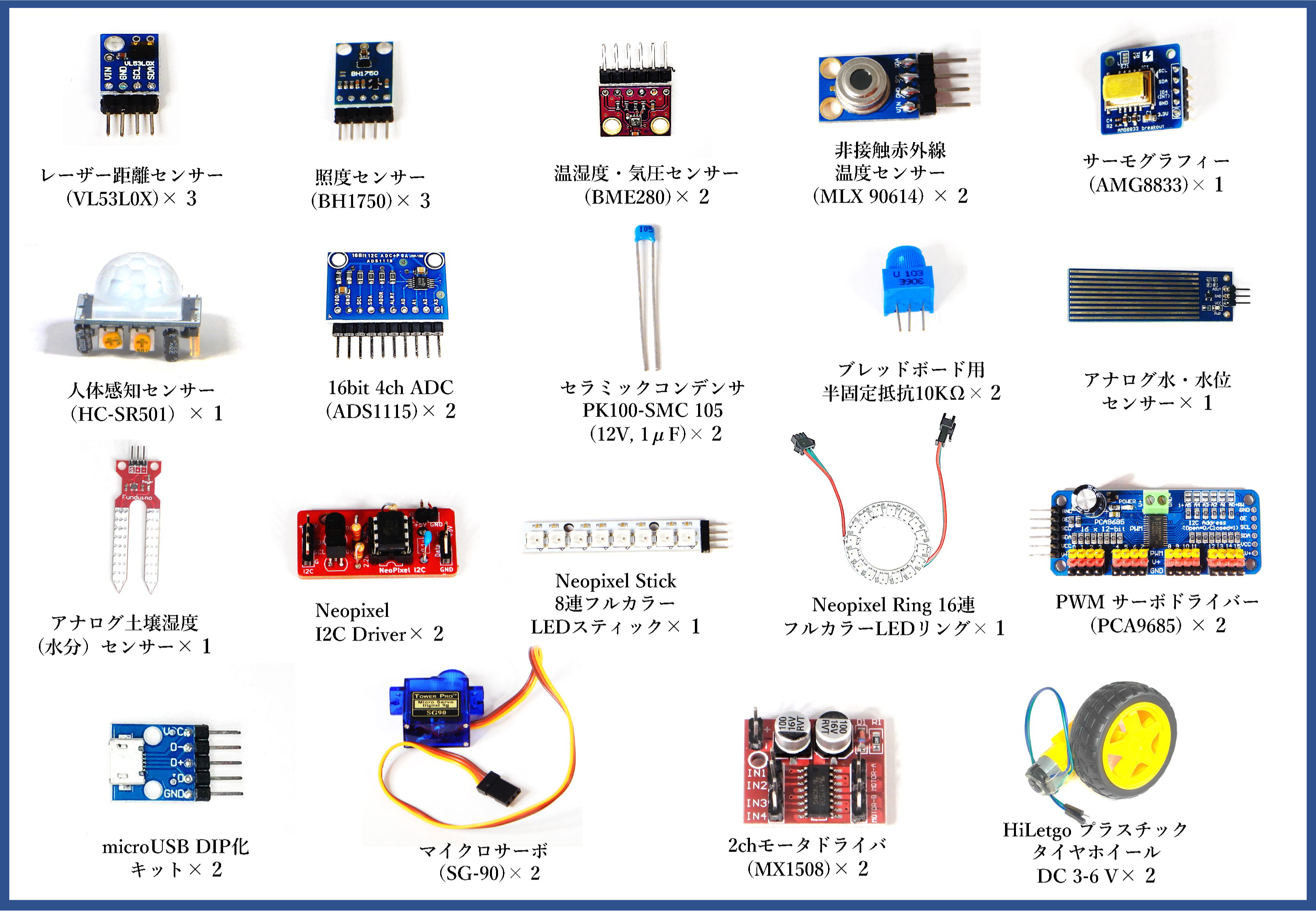 - 応用センサーキットはハッカソン等のアイディアを実装する際に使い勝手の良いセンサーを集めたキットです。