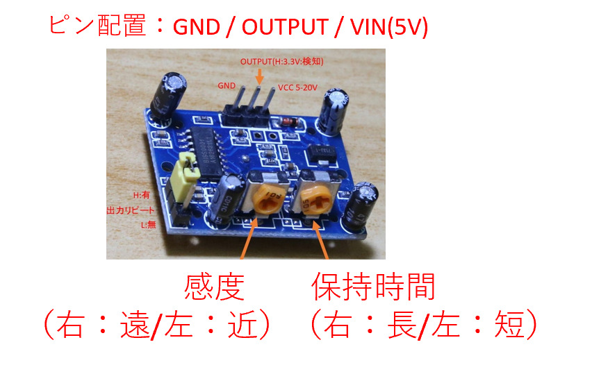 - センサーに感度と保持時間を調整するつまみがあるので調節してテストしてください。
