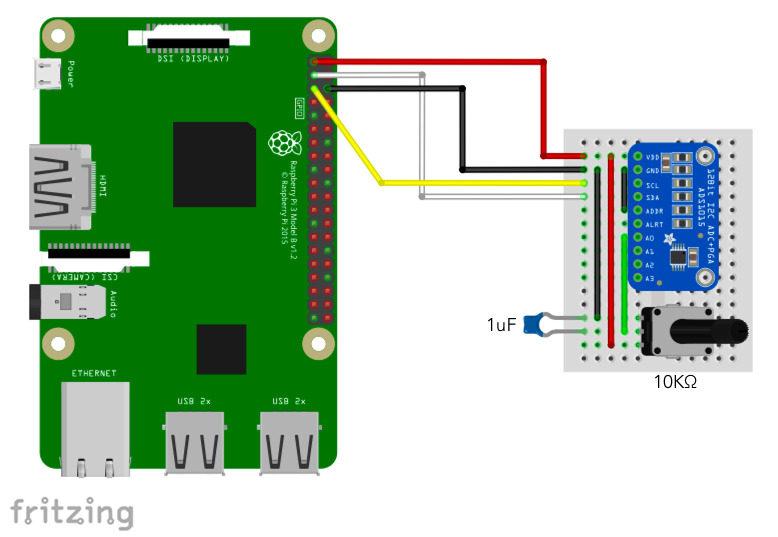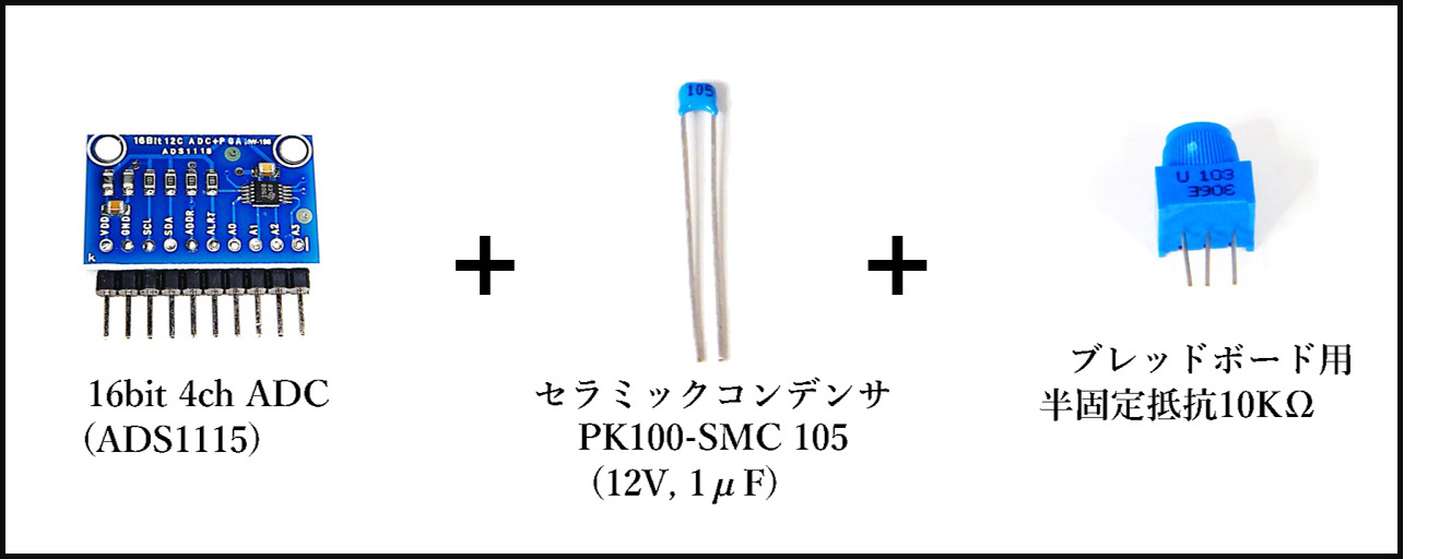 - アナログセンサーの利用は ADS1115 を使います。回路図にあるつまみは半固定抵抗 10KΩ を使用します。