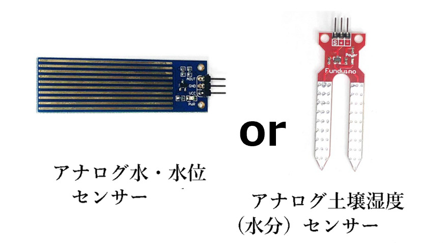 - 水位センサ、土壌湿度センサもアナログセンサーです。ADS1115 を併用して使います。